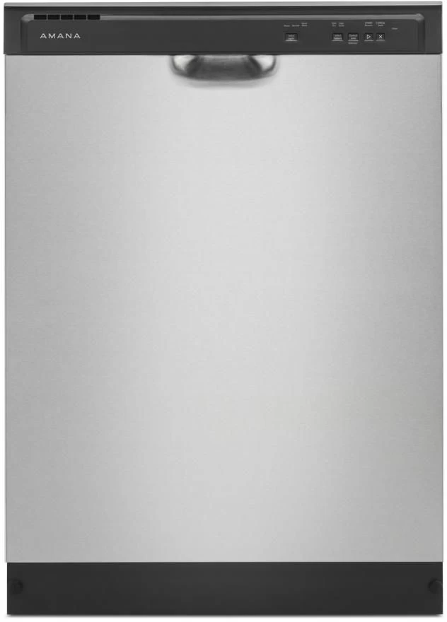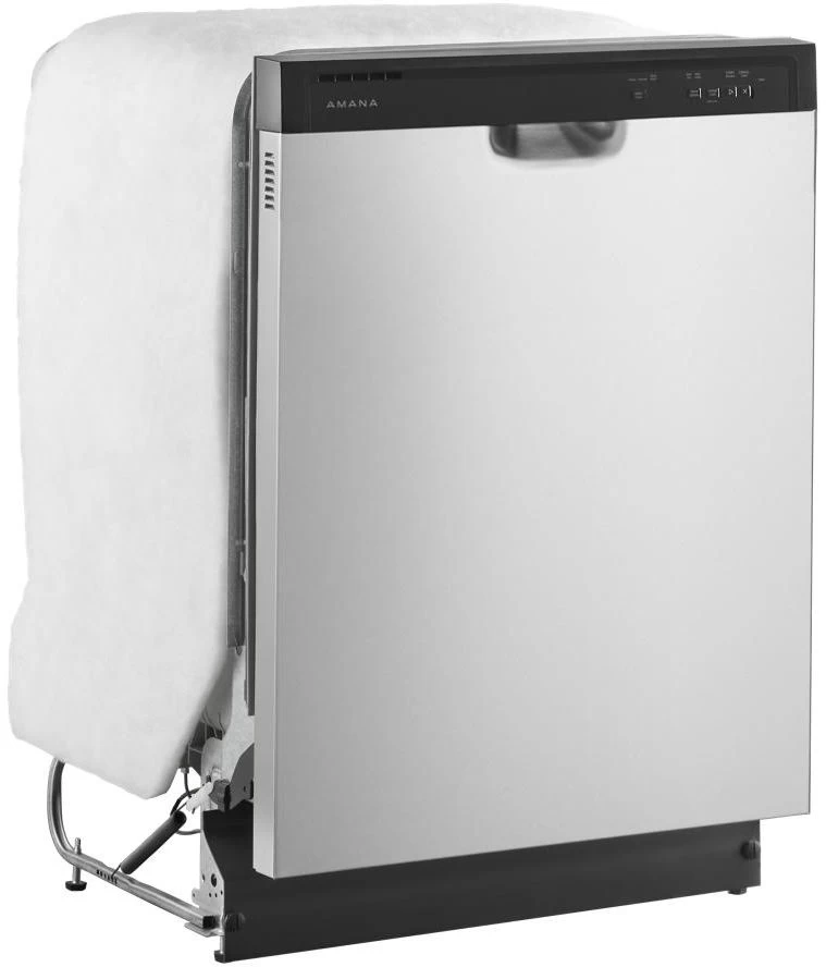 Featuring a slate gray plastic tub, this Amana® Dishwasher helps you clean away crumbs and messes thanks to the Triple Filter Wash System. A combination of three wash filters removes even tiny food particles from the wash water. The Heated Dry Option uses an internal heater to accelerate the drying process and the Slim Console brings clean lines to the kitchen.