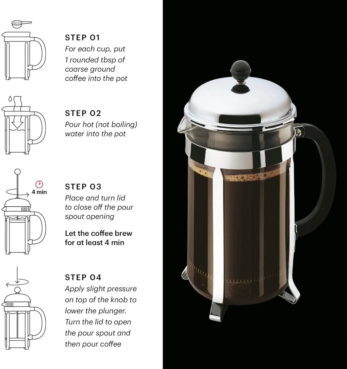 Bodum’s Chambord French Press Coffeemakers delivery a delicious cup of coffee in just four minutes with zero waste! No filters, no pods…just easy, delicious coffee. Pressed coffee extracts the perfect amount of essentials oils and acids from the coffee bean for maximum flavor; the preferred method for brewing for coffee enthusiasts everywhere.