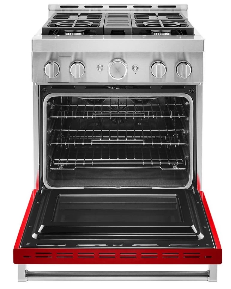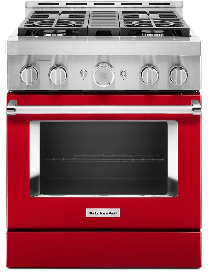 Empower your creativity with a 30-inch KitchenAid® Commercial Style Range with 4 burners. This gas range features two versatile 20,000 BTU Ultra Power™ Dual-Flame Burners with the power and precision needed to successfully sear, simmer, stir-fry and saute´. Even-Heat™ True Convection helps you achieve more consistent baking and roasting.