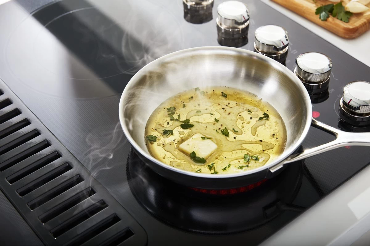 This 30” electric cooktop features Downdraft, an integrated ventilation system that doesn’t require a separate hood. A 10-inch Even-Heat™ Ultra element provides versatility for both high- and low-temperature cooking, and has multiple simmer settings. And with a 3-speed fan with 300 CFM exhaust rating, the venting can keep up with your culinary feats.