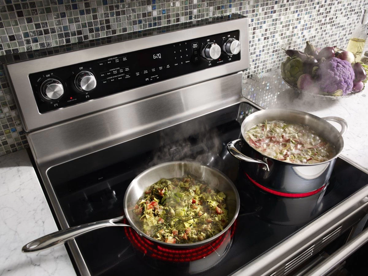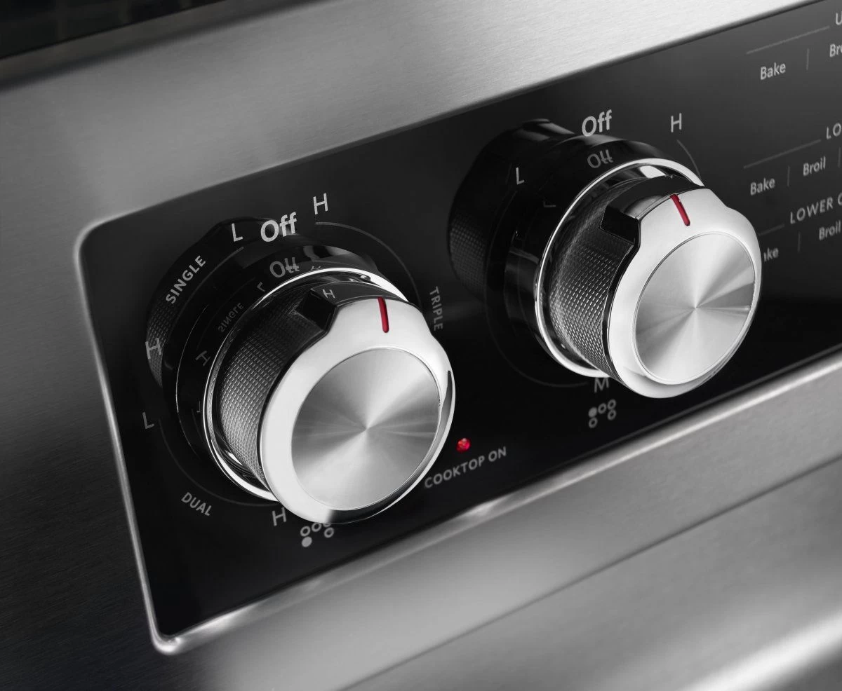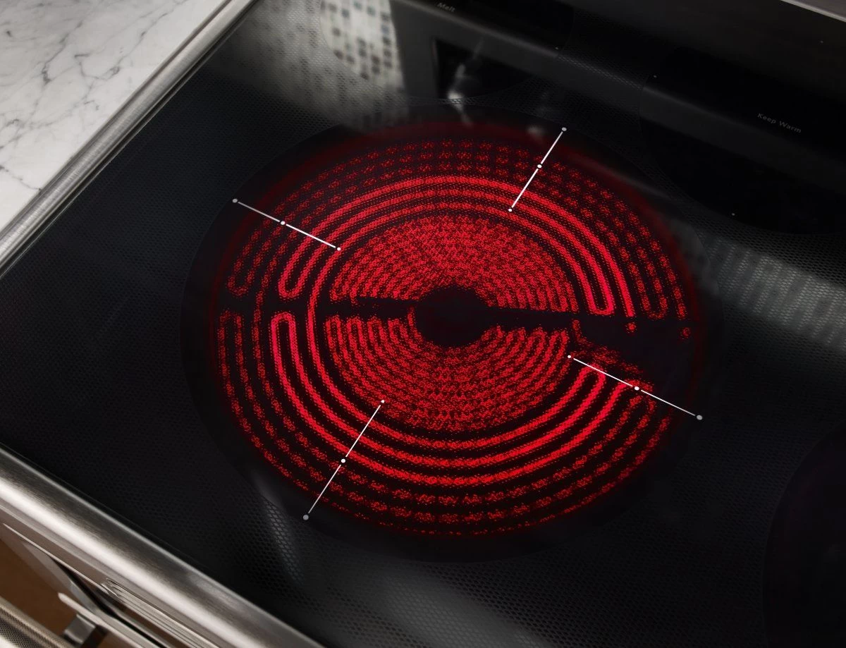 This beautiful electric double oven range produces flawless cooking results with Even-Heat™ True Convection. The unique bow-tie design and convection fan ensure the inside of the entire oven is heated to, and stays at, the perfect temperature. The ovens are a combined 6.7 cu ft., providing an extra-large capacity and separate temperature environments. The cooktop features five heating surfaces, including a dedicated warming zone, allowing you to do more on your range.