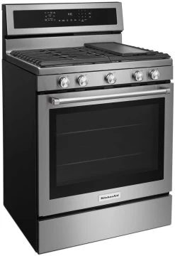 This beautiful gas freestanding range produces flawless cooking results with Even-Heat™ True Convection. The unique bow-tie design and convection fan ensure the inside of the entire oven is heated to, and stays at, the perfect temperature. The oven is 5.8 cu ft., providing a large capacity that’s perfect for preparing multiple dishes at once. The cooktop has 5 burners ranging from 5,000 to 18,000 BTU, letting you go from a rolling boil to a delicate simmer.