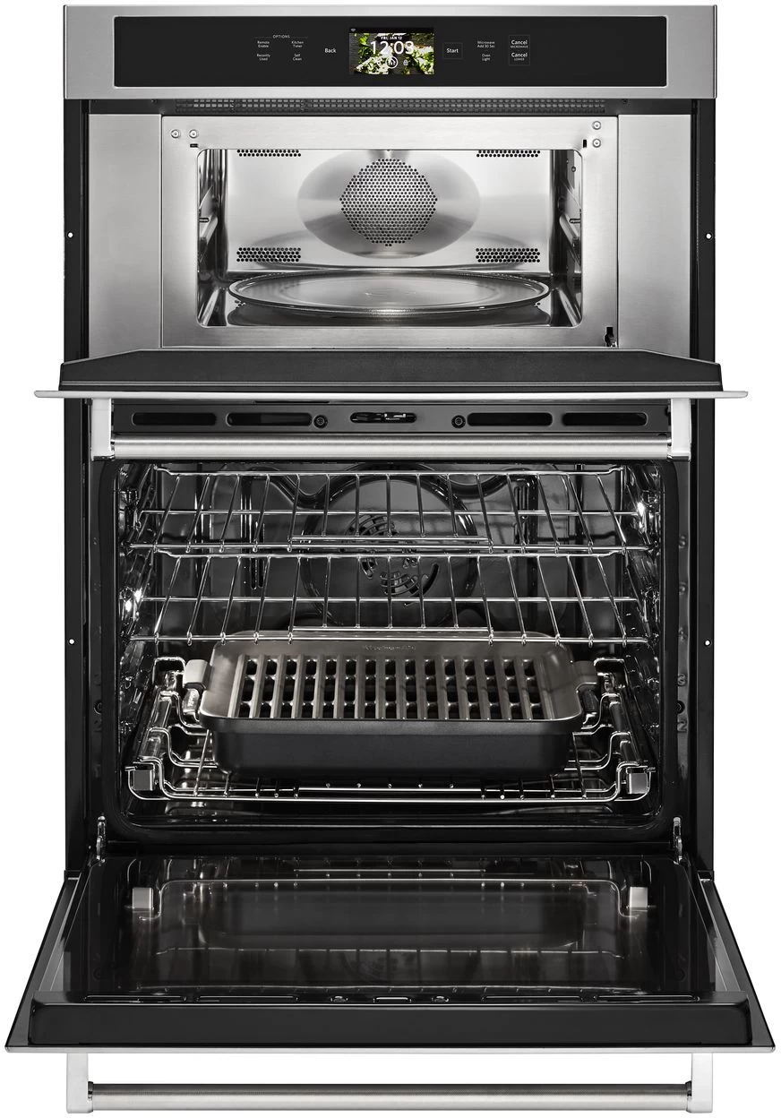 Open up new culinary possibilities. KitchenAid introduces the first combination wall oven that comes with interchangeable attachments in the tradition of the iconic KitchenAid® Stand Mixer to enable grilling, stone cooking and steaming. As cooks expect today from a premium wall oven, it also supports a full complement of smart capabilities as well as baking, broiling and Even-Heat™ True Convection.