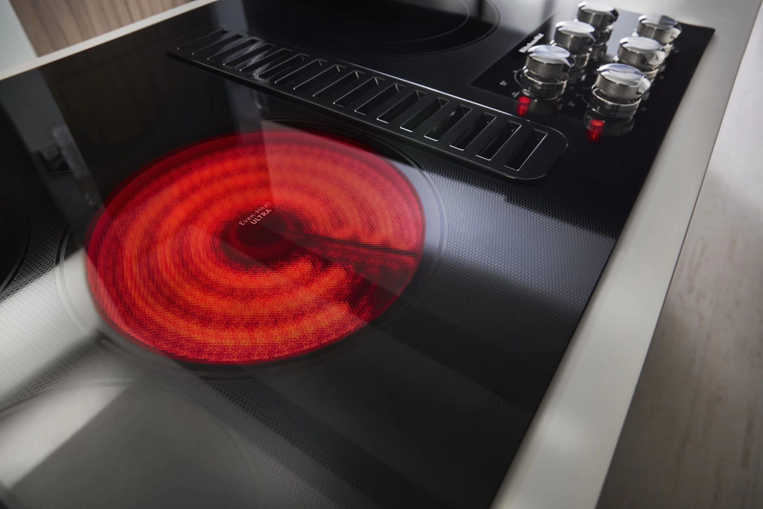 This 36” electric cooktop features Downdraft, an integrated ventilation system that doesn’t require a separate hood. A 10-inch Even-Heat™ Ultra element provides versatility for both high-and low-temperature cooking, and has multiple simmer settings. And with a 3-speed fan with 300 CFM exhaust rating, the venting can keep up withyour culinary feats.