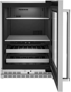This Undercounter Beverage Center with Full-Extension Metal-Front Racks holds 14 wine bottles below with room for drinks and food on the full-width shelves above. Separate temperature controls for the two zones adjust for what you’re storing, and a Temperature Monitoring System with sensor alert adds peace of mind.