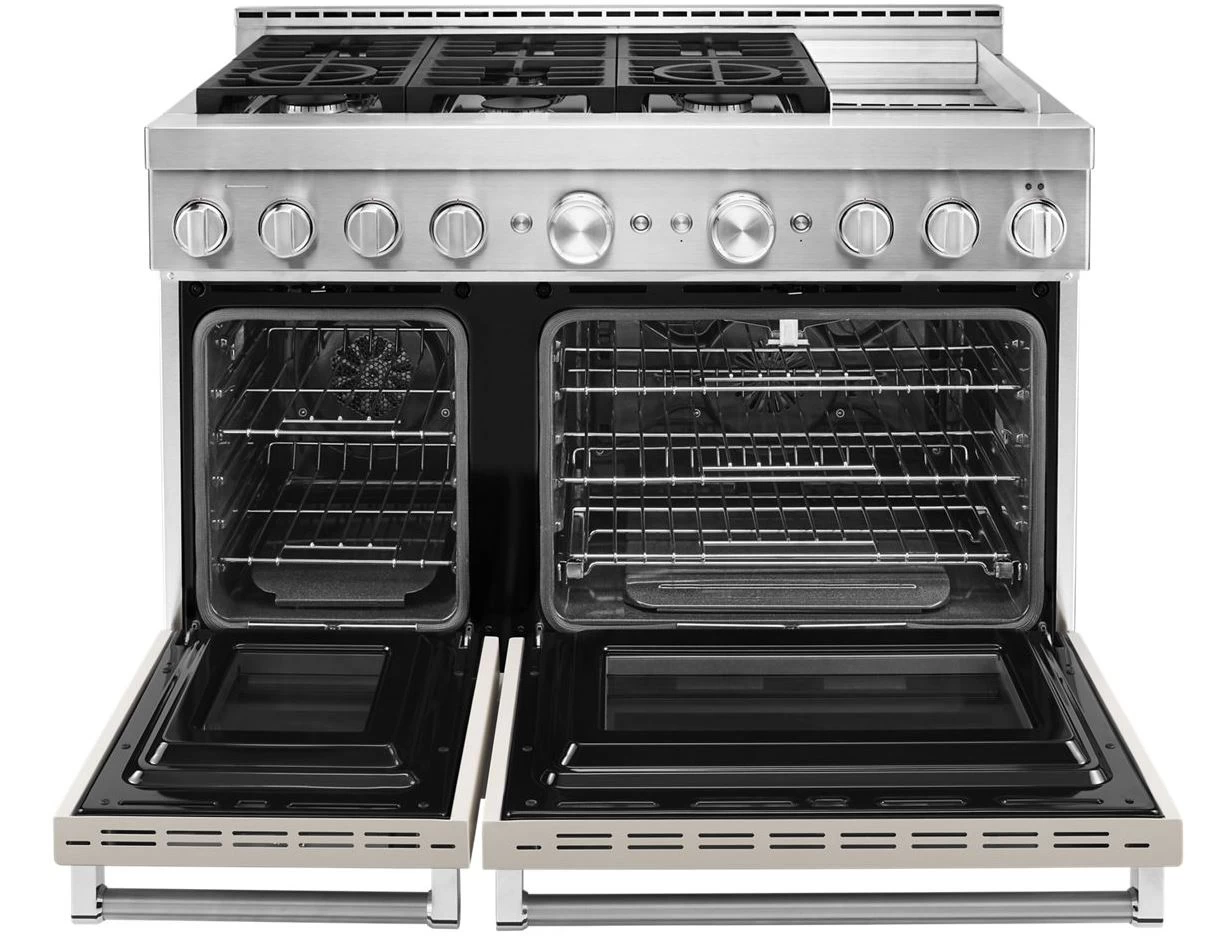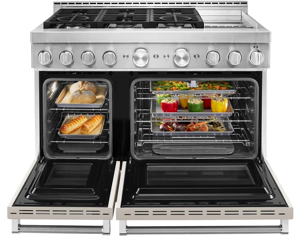 Satisfy your craving to create with a 48-inch KitchenAid® Commercial-Style Range with Even-Heat™ Chrome Electric Griddle. This 6-burner gas range features two versatile 20,000 BTU Ultra Power™ Dual-Flame Burners with the power and precision to successfully sear, simmer, stir-fry and saute´. The double oven with Even-Heat™ True Convection helps you achieve more consistent baking and roasting.