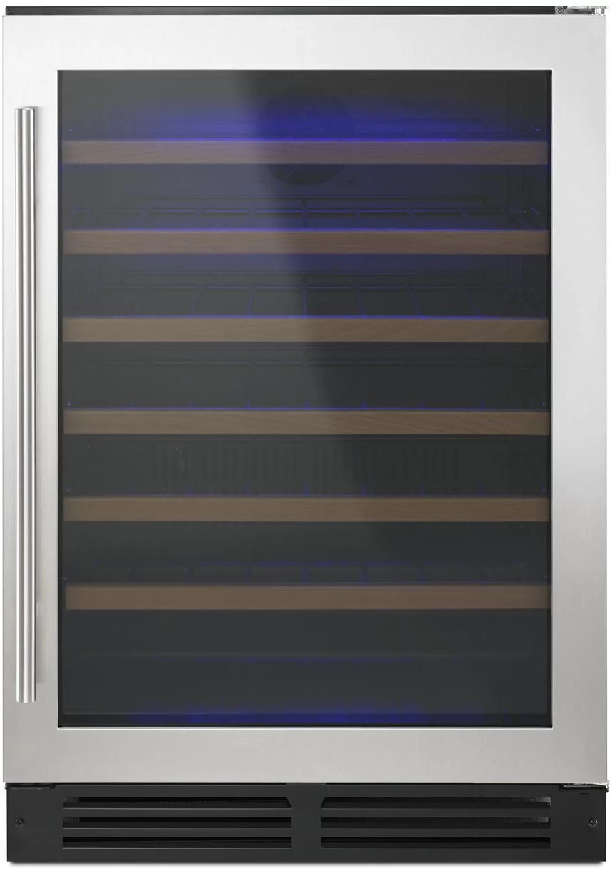 Whirlpool® 24″ Undercounter Wine Center-Black-On-Stainless with wood front racks, door open alarm and reversible door
