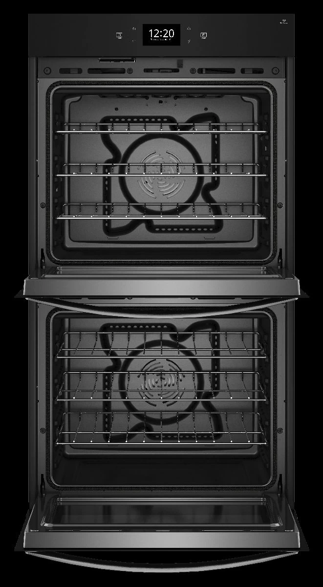 Whirlpool® 27″ Stainless Steel Double Electric Wall Oven features Frozen Bake technology, Keep Warm setting, Multi-step cooking, Touchscreen, True convection cooking, Convection conversion, Steam Clean option, and Sabbath Mode.