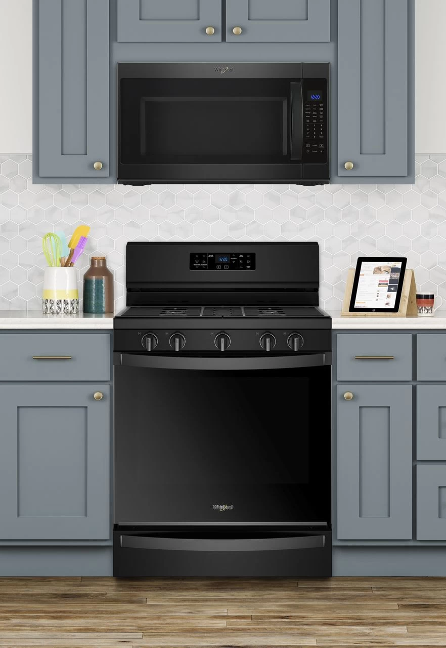 Whirlpool® 30″ Freestanding Gas Range-Black with 5.8 cu. ft. total capacity, 5 burners and Sabbath mode