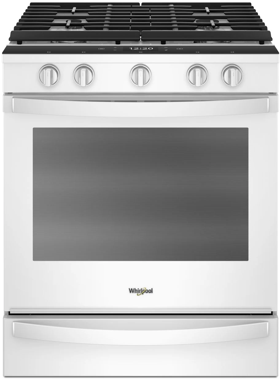 Whirlpool® 30″ Smart Slide-In Gas Range-White with 5.8 cu. ft. total capacity, Z-2-Lift™ hinged cast-iron grates and Frozen Bake™ technology